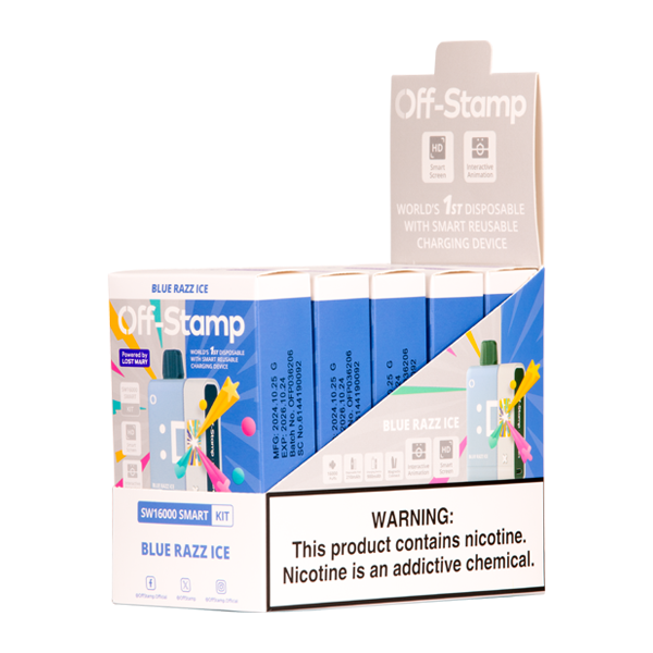 <h3 style="padding-left: 280px;"><span><strong>OFF STAMP SW16000 KIT</strong></span></h3> <p><span><strong>Off Stamp SW16000 kit includes the pre-filled Off Stamp Disposable Vape device and the 900mAh charging dock battery, which can be affixed to power and charge the Off Stamp SW16000 and SW9000 disposable vape pod kits.</strong></span></p> <p>Each kit includes the pre-filled Off Stamp Disposable Vape device and the 900mAh charging dock battery, which can be affixed to power and charge the Off Stamp SW16000 and SW9000 disposable vape pod kits.</p> <p>The disposable vape half contains a 210mAh battery, which requires the dock to recharge and can tide you over while it is quickly brought back with type-C USB charging.</p> <p>With flavors and tech powered by Lost Mary, the charging dock battery contains the bulk of the electronics and is reusable, making the Off Stamp SW16000 and SW9000 an eco-friendlier approach to disposable vaping. The disposable vape component holds 17ml of e-liquid and generates an estimated 16,000 puffs.</p> <ul> <li><strong>E-liquid contents</strong>: 17ml</li> <li><strong>Nicotine Level</strong>: 50mg</li> <li><strong>Puffs per Device</strong>: 16,000+</li> <li><strong>Disposable Vape Battery</strong>: 210mAh (Rechargeable via Off Stamp Battery Pack Only)</li> <li><strong>Use:<span> </span></strong>View battery life with two clicks and animations with single click. </li> <li><strong>Battery Pack/Charging Dock:</strong><span> </span>900 mAh Smart Battery (included in all Off Stamp kits and compatible with Off Stamp SW9000 and Off Stamp SW16000 series disposable vape pods).</li> <li><strong>Mesh Coil</strong></li> <li><strong>POWERED BY LOST MARY</strong></li> </ul>
