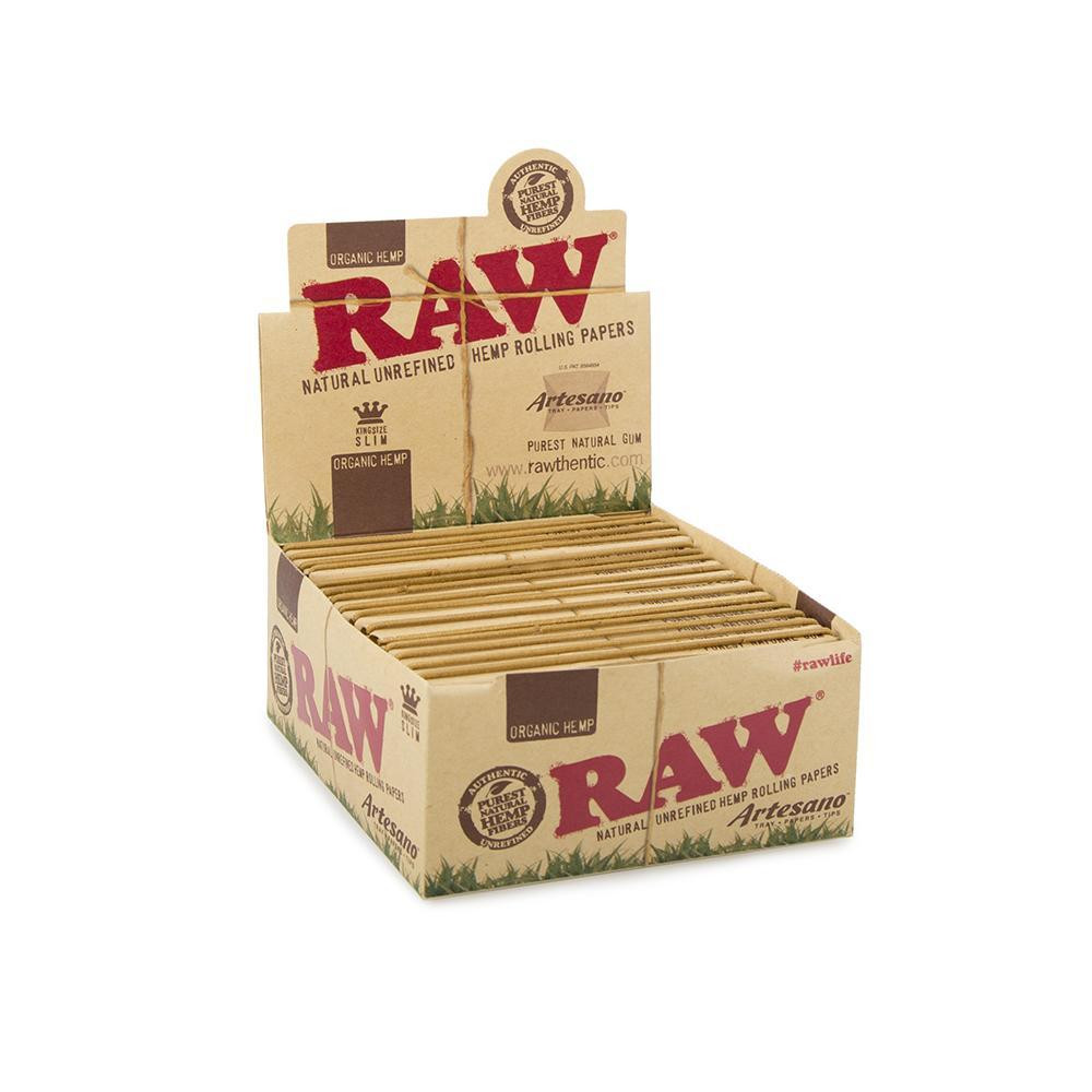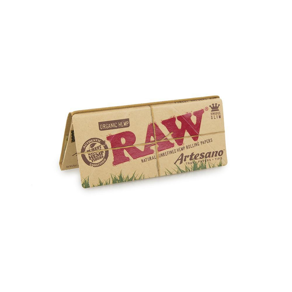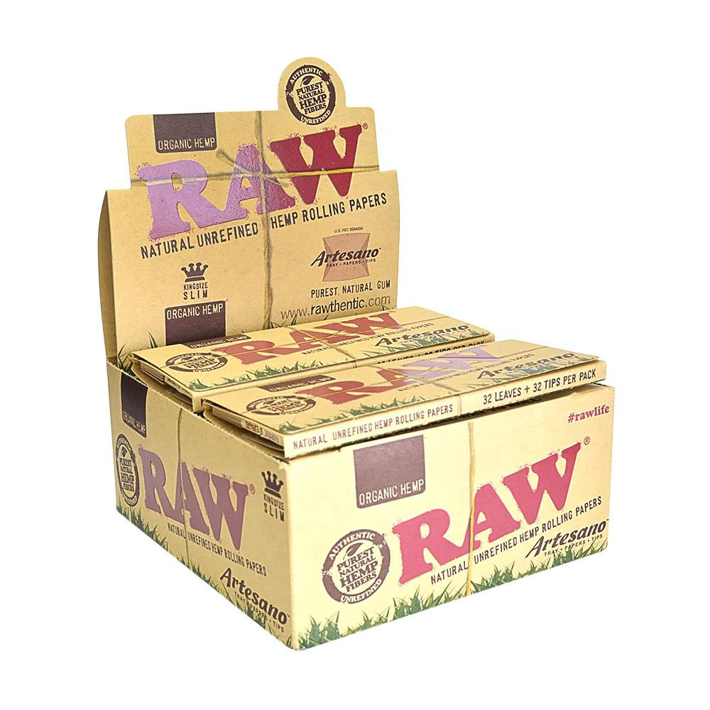 Raw Organic Artesano King Size Slim + Tips & Paper Rolling Tray 3-in-1 system—-King Size Slim, tips, & a paper rolling tray 15 Packs Per Box 32 Tips Per Pack 32 Leaves Per Pack RAW is all natural, unbleached, and vegan. Chlorine-free.