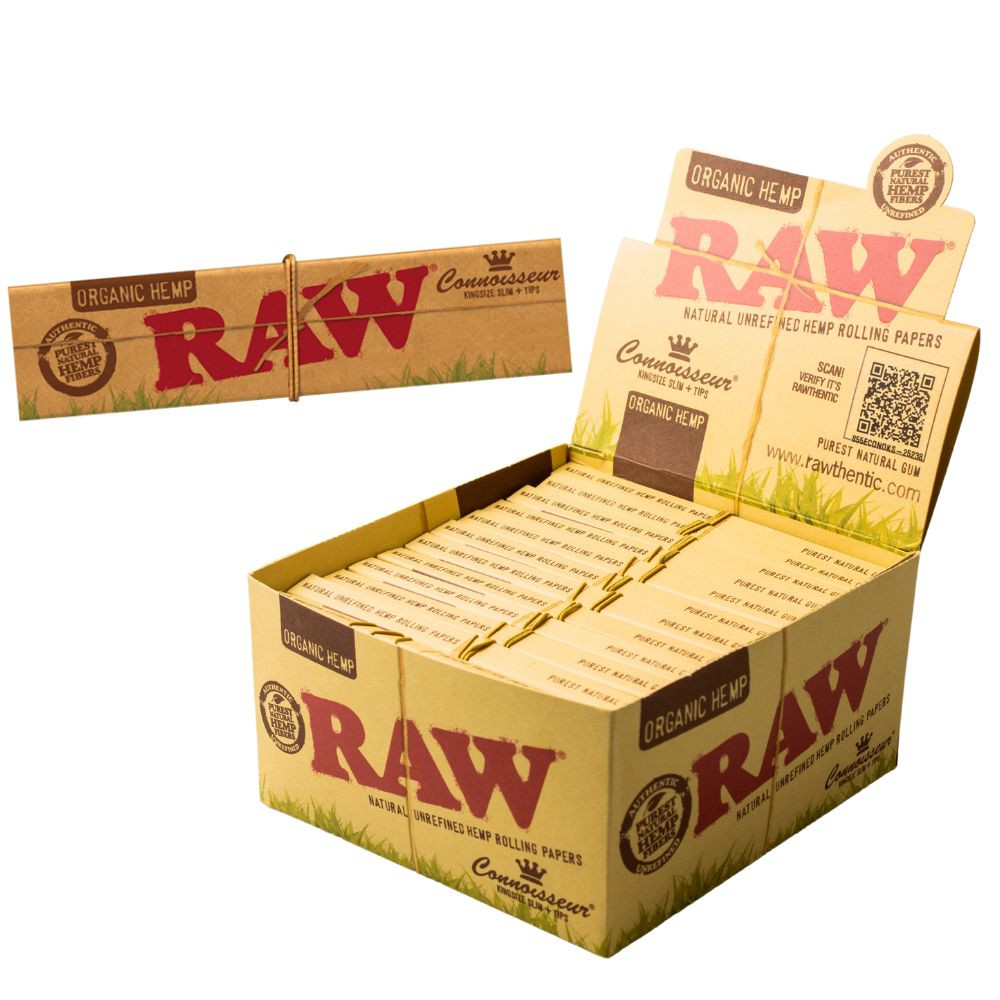 Raw Organic Connoisseur King Size Slim + Tips 24 Packs Per Box 32 Leaves Per Pack 32 Tips Per Pack The Only Natural Way To Roll-